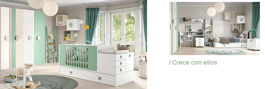 Cunas convertibles son las cunas compactas con elementos de almacenamiento y un cambiador asociados. Además, cuando tu hijo ya tenga que pasar a su primera cama se transforman en una camita con cajones, mesilla, escritorio... todo lo necesario para su primera habitación de niño grande.